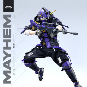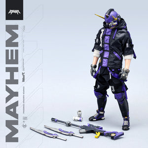 Mayhem, the Reaper of Mecha Will Rise makes his debut in the 1/6 scale. This 12" super posable action figure comes with an arsenal of weapons including a gun the can combine with blades to become a death sycthe blade.